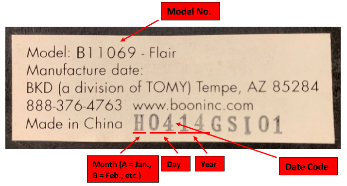 Only a Boon Flair and Flair Elite Highchairs manufactured by TOMY International before September 2016 are being recalled. The recalled highchairs can be identified by the manufacturing date code printed on a label located under the base of the highchair.