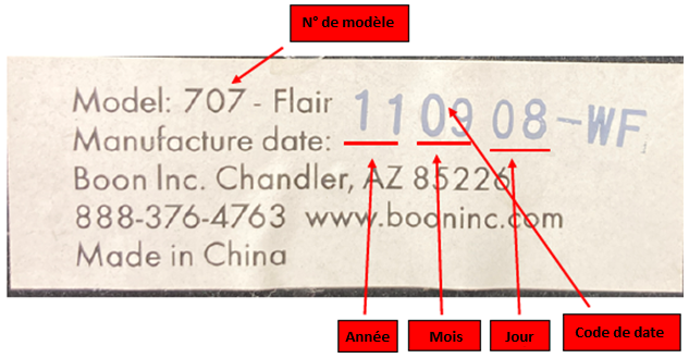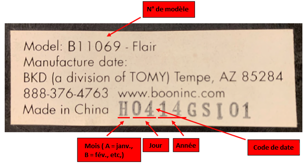 Seules les chaises hautes Boon Flair et Flair Elite fabriquées par TOMY International avant septembre 2016 font l'objet d'un rappel. Les chaises hautes concernées sont identifiables grâce au code de date de fabrication imprimé sur une étiquette apposée sous la base de la chaise haute.