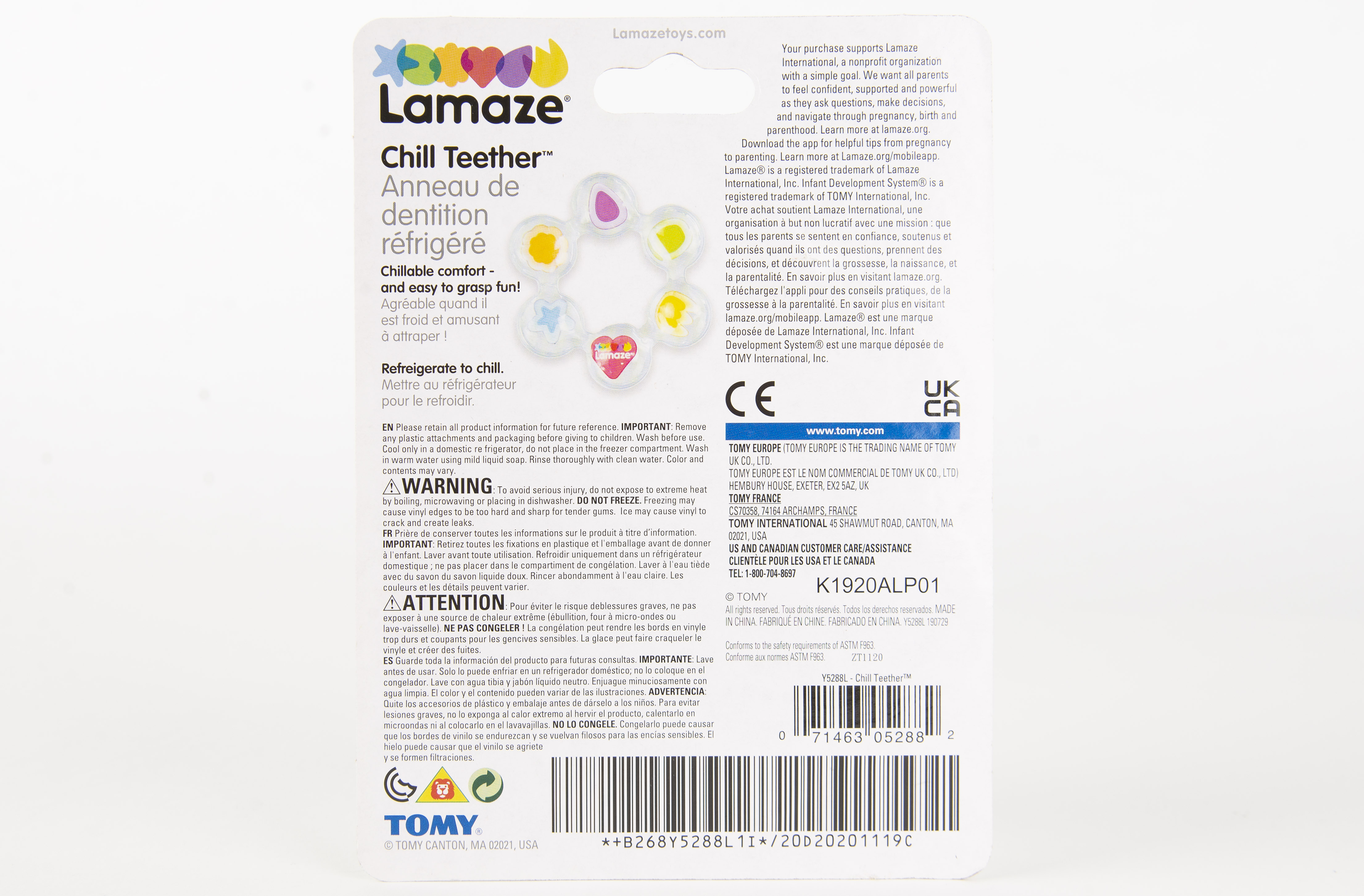 Seule une série spécifique du jouet de dentition réfrigérant Lamaze fabriqué par TOMY International fait l’objet de ce rappel. Les jouets de dentition rappelés peuvent être identifiés par le numéro d’article Y5288L, le CUP 071463052882 et les codes de production E1920ALP01 et K1920ALP01. Le numéro d’article et le code de production se trouvent directement au dos du produit et de l’emballage. Seuls les jouets de dentition portant les codes de production E1920ALP01 et K1920ALP01 sont concernés par ce rappel.